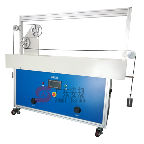 电源线曲挠试验机是广东安规检测有限公司根据IEC60227-2、GB/T 5023.2《额定电压450/750V及以下聚氯乙烯绝缘电缆 第2部分:试验方法》标准第3.1节及图1设计制作而成的,适用于IEC60227-1、GB/ 5023.1《额定电压450/750V及以下聚氯乙烯绝缘电缆 第1部分:一般要求》第5.6.3.1节要求的对于软电缆正常使用时的弯曲和其他机械应力强度检测。广东安规检测有限公司生产的电源线曲挠试验机使用PLC及彩色触摸屏预置与控制、带速度微调功能、屏幕显示实时当前运动速度、预置式全自动计时计数、可初始化回原点、带0~450V可调电压与电流负载无需外接负载柜、带表1所有要求的砝码与滑轮、电流断路检测报警、电流短路检测。本款设备通过PLC控制,彩色触摸屏显示、控制、设定测试程序,用户可以方便简单地达到测试条件。
