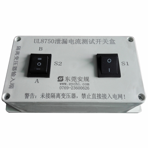UL8750泄漏电流测试盒是广东安规根据UL8750图8.5(旧版图8.2)及8.9节要求制作而成,它包含双极开关S1和双极开关S2,以及输入耦合器及多功能输出插座,但不含1:1隔离变压器,不含零线端子。